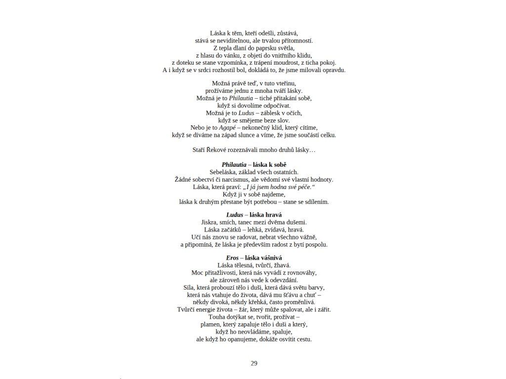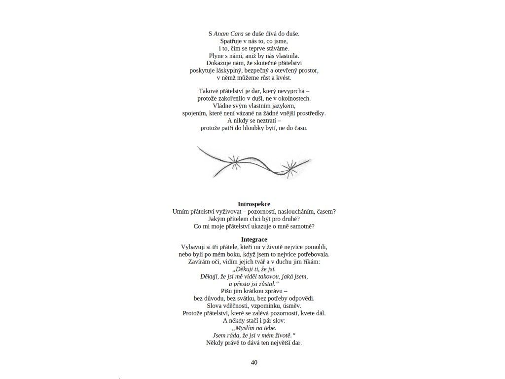 Každá kapitola je doplněna otázkami k introspekci a podněty k integraci do každodenního života. Kniha tak neslouží pouze ke čtení, ale i k postupnému prožívání a návratu k vlastní zkušenosti.