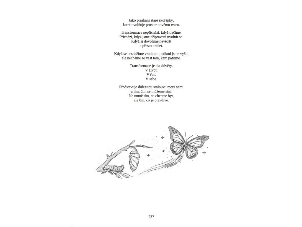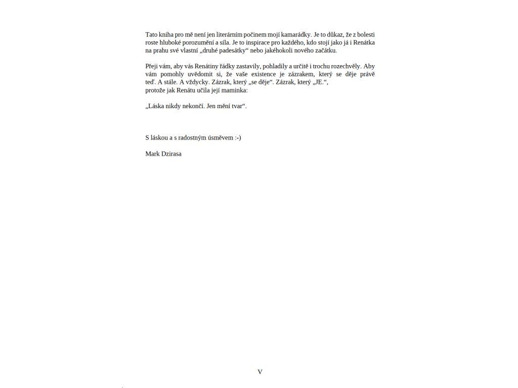Knihu uvádí předmluva Marka Dzirasy, dlouholetého kamaráda autorky. Jeho text přináší mužský pohled na obdobné životní zastavení a rámuje základní téma knihy – vědomou osobní bilanci a další směřování.